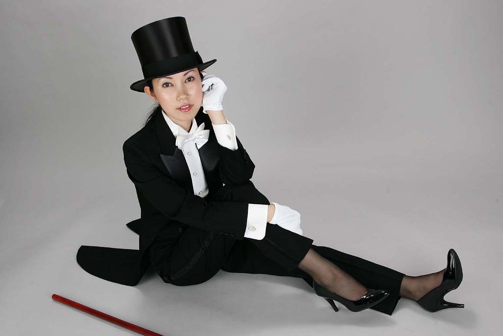 まず、1番の画像。これは、NHKで放映された韓国ドラマ「オールイン」に出てきた、 済州島の女性カジノディーラーが着ていた制服をイメージしたものです。 ブラウスの上にベストを着るのは、中学・高校の制服制服から、OLまで、 幅広く採用されています。しかし、この画像では、ベストの衿がタキシードのような ヘチマ衿になっています。普通のベストに比べて、ずっとフォーマルな雰囲気を かもし出しています。 そして2の画像。このベストは、カマーベストと言い、首の後で留めるものです。 バーテンダーなどが着ている格好です。また、下(ボトム)をパンツに替えた だけで、これほどカッコイイ雰囲気に様変わりするのです。 3は、いよいよ本格的なタキシードを着せてみました。しかし、このタキシードは、 サイズが女性用になっており、また、靴はピンヒールを履いており、これほど 本格的なタキシードでありながら、「男装」というようなイメージはなく、あくまで、 「カッコイイお姉さん」というような雰囲気をかもし出しています。 4は、丈の短いタキシード(スペンサージャケット)に、ボトムはスカート。蝶ネクタイ、 カマーバンド、ポケットチーフは赤にしてみました。どうですか?同じタキシードとは 思えないほど、男性的な要素は全く感じられず、むしろ「かわいさ」すら感じさせます。 さて、5でいよいよ究極のフォーマルアイテムの燕尾服の登場です。男子の第一 礼装とされ、外出時にはシルクハット、ステッキ、白手袋の装着が義務付けられます。 しかし、この燕尾服は、当店が長年の研究の末開発した、女性用燕尾服で、 サイズも女性の体にぴったりフィットしています。上から下まで(靴は除く)男子の 第一礼装で固めているはずなのに、不思議なことに全く「男性」を感じさせません。 以上、色々な種類のタキシードと、その仲間たちを見てきましたが、全てに共通して 言えることは、サイズさえ女性用にアレンジされていれば、カッコイイ雰囲気には なっても、決して「男装」というイメージは伴わない、ということです。たとえ、男子の 第一礼装の燕尾服のフルセットを着用しても、それは同じ、ということです。 ですから、世の女性の皆さん、安心してタキシードと、その仲間たちを着て下さい きっと、そのセクシーな雰囲気に、周囲の人々は圧倒され、あなたはたちまち 注目の的となるでしょう。 ■男性用タキシードと女性用の違いについて■ さて、ところで男性用のタキシードと女性用とでは、どこが違うのでしょうか? まず、 男性と女性では体型が違います。ですから、女性が男性用をそのまま着たのでは、 まさしく「男装」になってしまいます。女性用はバスト部分に「ダーツ」と呼ばれる、 生地の立体的な接(は)ぎ合わせを入れて、胸の膨らみを出しています。 また、ウエスト部分はとことん絞り込み、女性ならではの流れるような体のラインを 出しています。上の画像4でモデルが着ているタキシードジャケットは、正確にはメス ジャケット或いはスペンサージャケットと呼ばれているもので、通常のタキシードに比べて 丈が短くなっています。これも、女性ならではの腰のふくらみを隠さぬよう、あえて丈を 腰のあたりまでの長さにしているのです。 同じくパンツ(ズボン)も男性用とは異なります。画像2のパンツは、女性ならではの 足の綺麗なラインを出すために、スリムパンツを履いています。これは、女性の場合、 ウエストとヒップの差が男性よりも大きく、また、男性よりも足が細いからです。 もちろん、お好みによっては男性用と同じくらい丈の長いジャケット(上の画像3)を 着たり、スリムパンツではないパンツを穿いても構いません。ただし、見た目が スペンサージャケットやスリムパンツに比べて、相当男性っぽいイメージになることを ご承知おき下さい。タキシードの持つ力強さを求めたい方は、こちらをお勧めします。 その他、女性用ならではの装備として、肩パットがあります。ご存知の通り、女性の 肩は男性よりも「なで肩」の場合が多いですが、タキシードまで「なで肩」にしてしまうと、 バランスが悪いようです。そこで、女性用には肩パットを入れています。 ■タキシードの購入について■ ここまで、長い文章にお付き合いいただきありがとうございました。あなたもきっと タキシードを着てみたくなったことでしょう。では具体的に、どこで購入すれば良い のでしょうか?実は、意外なことに、本格的な女性用のタキシードの既製品は、 日本にはほとんど存在しないのです。ホテルやレストランなどのサービスユニホーム用 として、タキシードに近い物はあります。しかし、それらは残念ながら、デザイン的にも 使用している生地なども、「タキシード」と呼べるレベルではないのです。 既製品が存在しないのなら、紳士服の仕立て屋さんでオーダーするしかないですが、 女性の方がタキシードをオーダーするのはちょっと